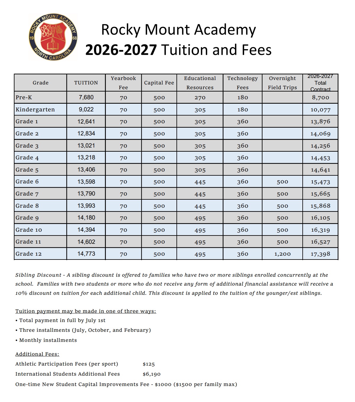 Rocky Mount Academy, like most independent schools, does not receive federal, state, or local government funds. Therefore, it is financed largely by tuition and fees then supplemented by donations and endowment income. We recognize that paying for education is always a sacrifice for families, but it is also one of the best investments that a parent can make in a child's future.
